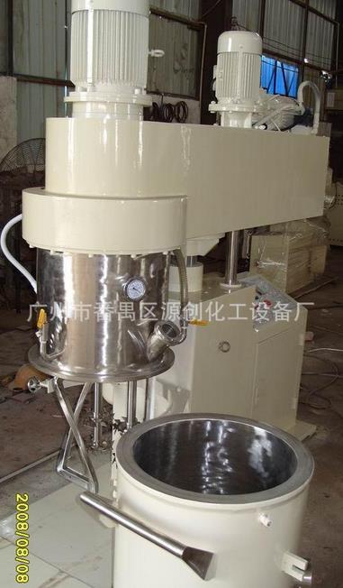 乳化真空攪拌機(jī)由攪拌桶、攪拌蓋、攪拌動(dòng)力頭(含兩組低速攪拌槳、兩組高速分散器及一組刮壁槳)、溫控裝置、升降裝置、鎖桶裝置及控制系統(tǒng)等組成。